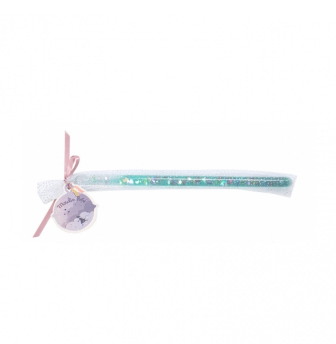 Questa bacchetta magica di colore rosa della collezione Il etait une Fois di Moulin Roty contiene gel e una moltitudine di glitter a forma di pastiglie, stelle, cuori o lune.