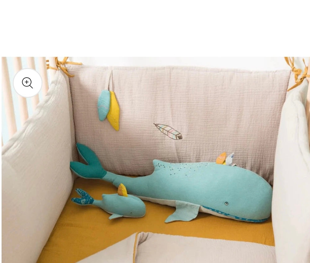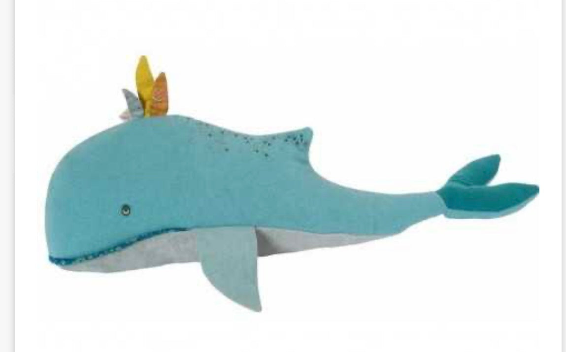 Bellissimo peluche a forma di Balena, morbido ed elegante sarà perfetto per le coccole e per regalare un tocco speciale alla cameretta di ogni bambino. Lungo quasi 60 cm può essere utilizzato anche come cuscino. Questa bellissima Balena fa parte della collezione Le Voyage d'Olga di Moulin Roty.