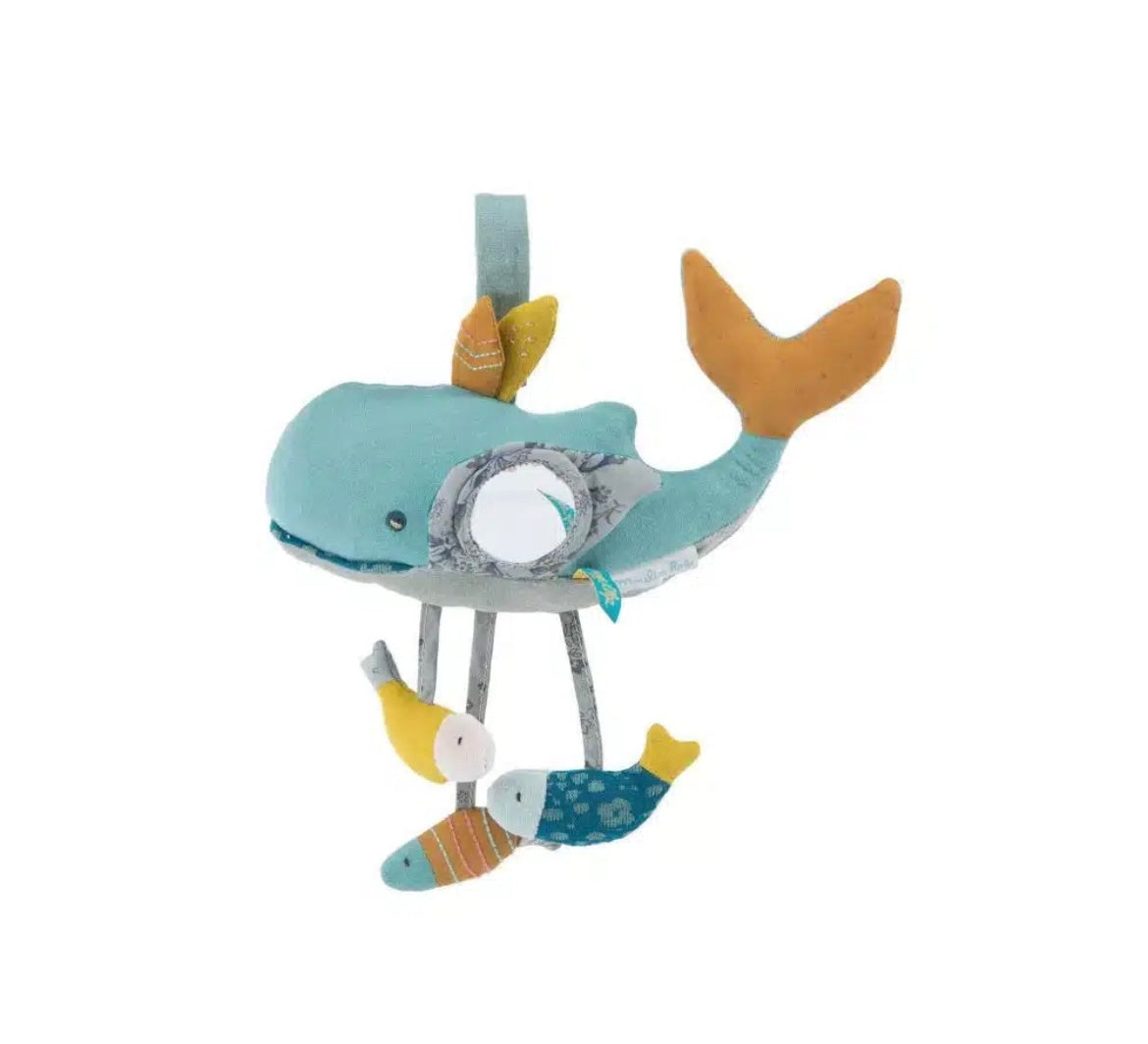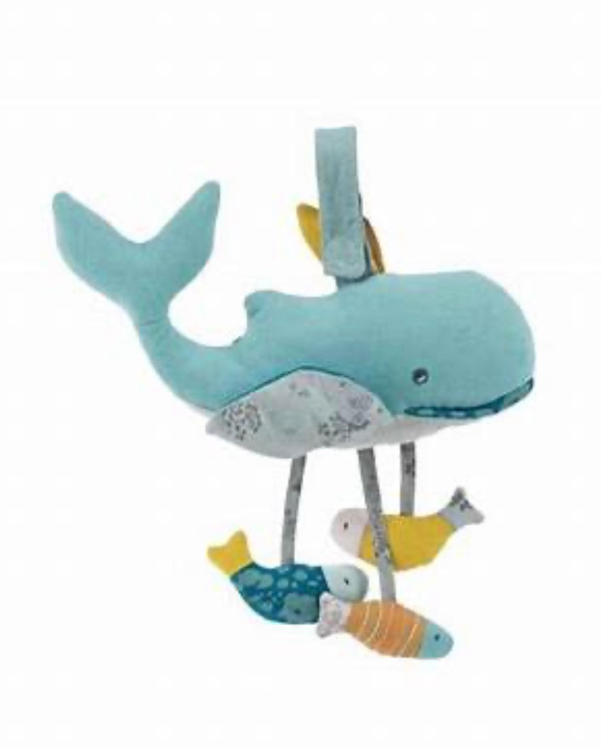 Si può appendere a culle e passeggini usando il gancino blu.