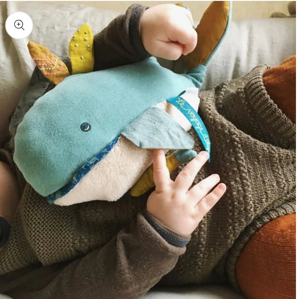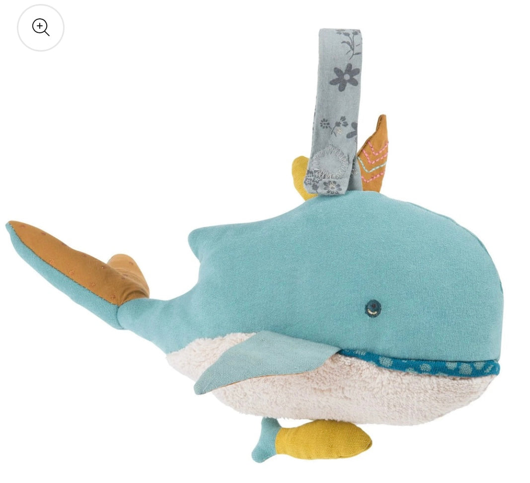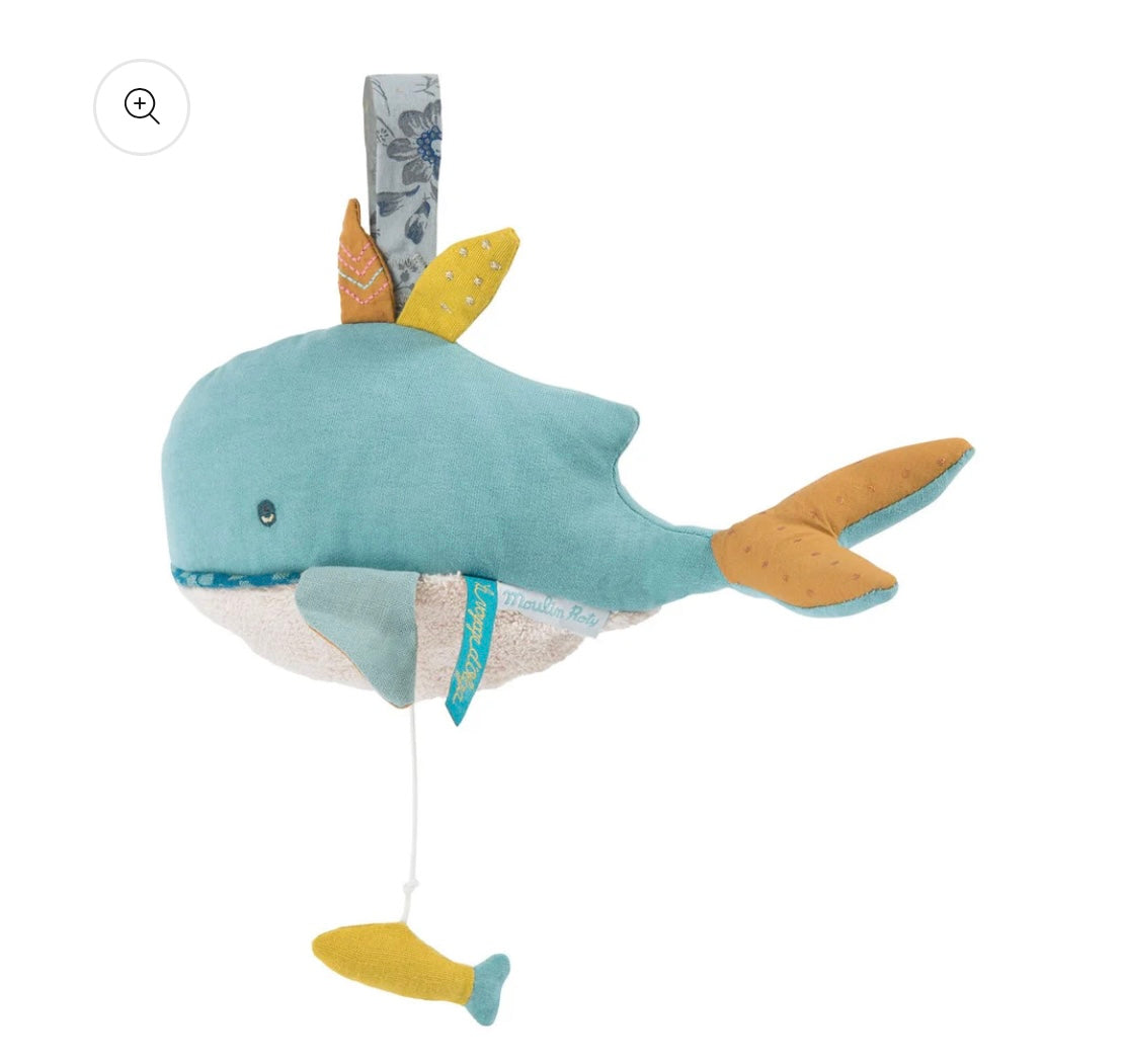 Un Carillon Peluche a forma di Balena in morbido tessuto, dai colori tenui ed eleganti e dotata di anello in stoffa per essere appesa. Tirando il piccolo pesciolino giallo posizionato sulla pancia della balena, il carillon comincia a suonare riproducendo una melodia dolce e rilassante. Il carillon può essere estratto facilmente dal peluche. Questa bellissima Balena fa parte della collezione Le Voyage d'Olga di Moulin Roty.