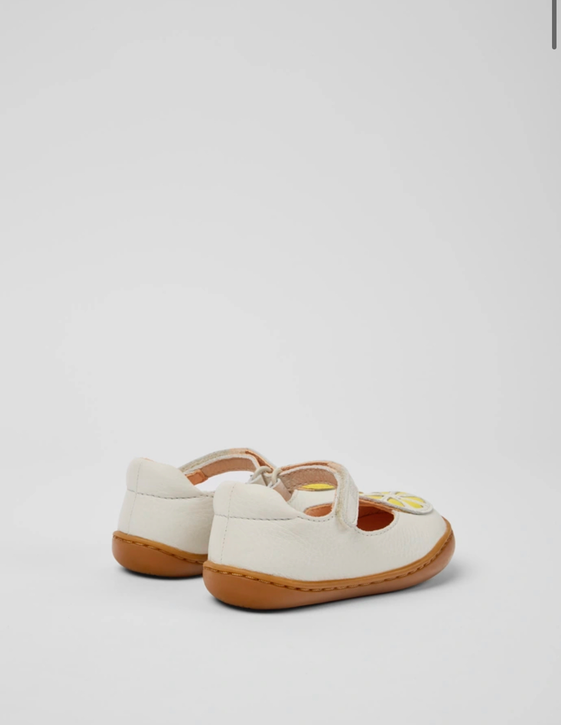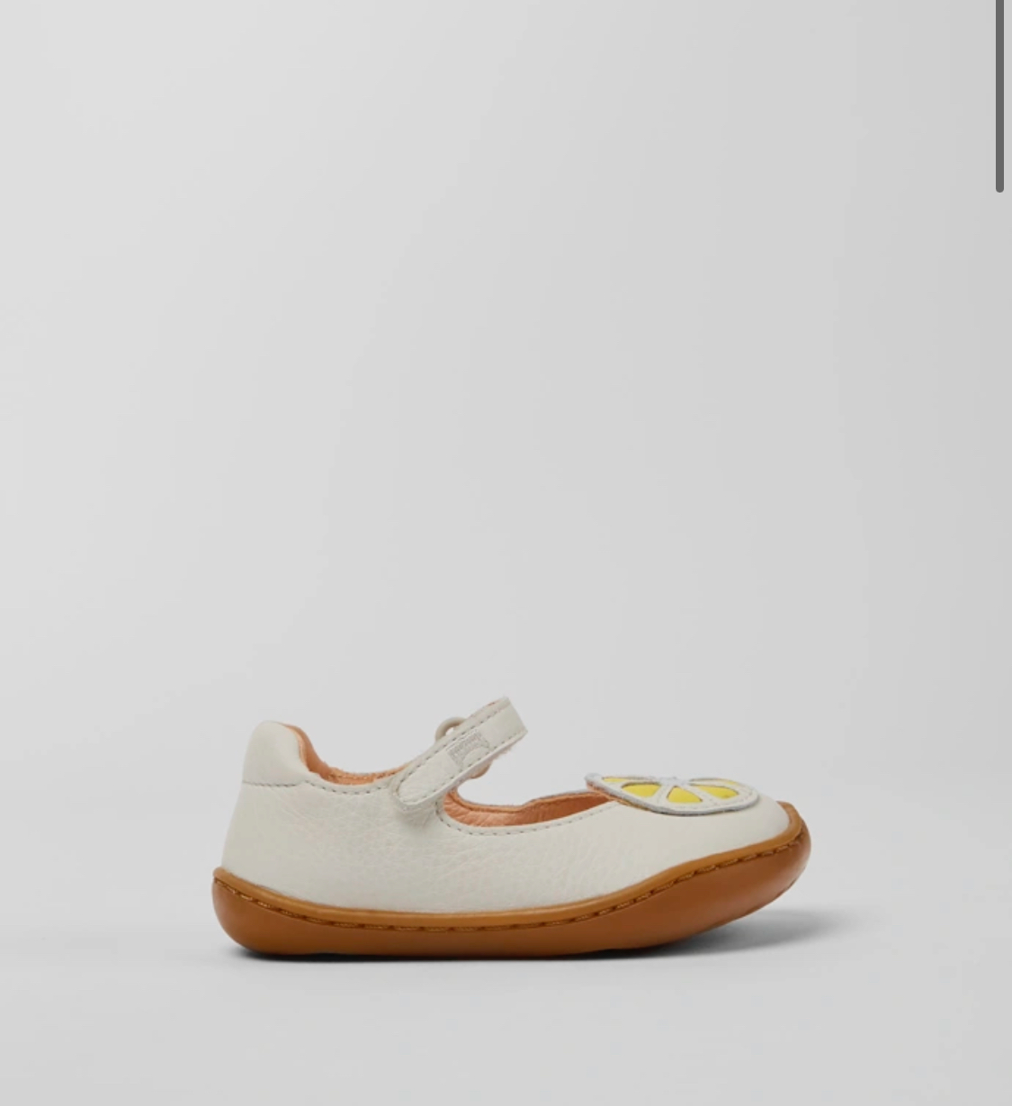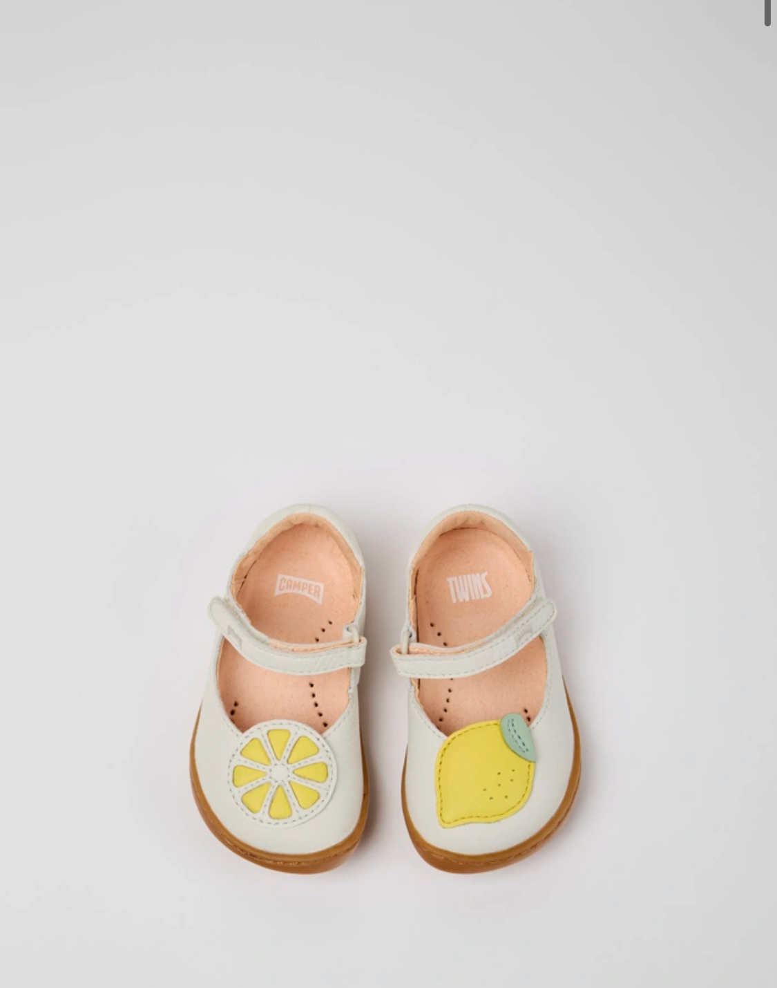 Scarpa per bambine in pelle bianca con dettagli gialli e verdi, suola in gomma cucita (20% riciclata) e sistema di chiusura in velcro.