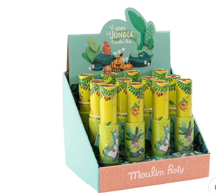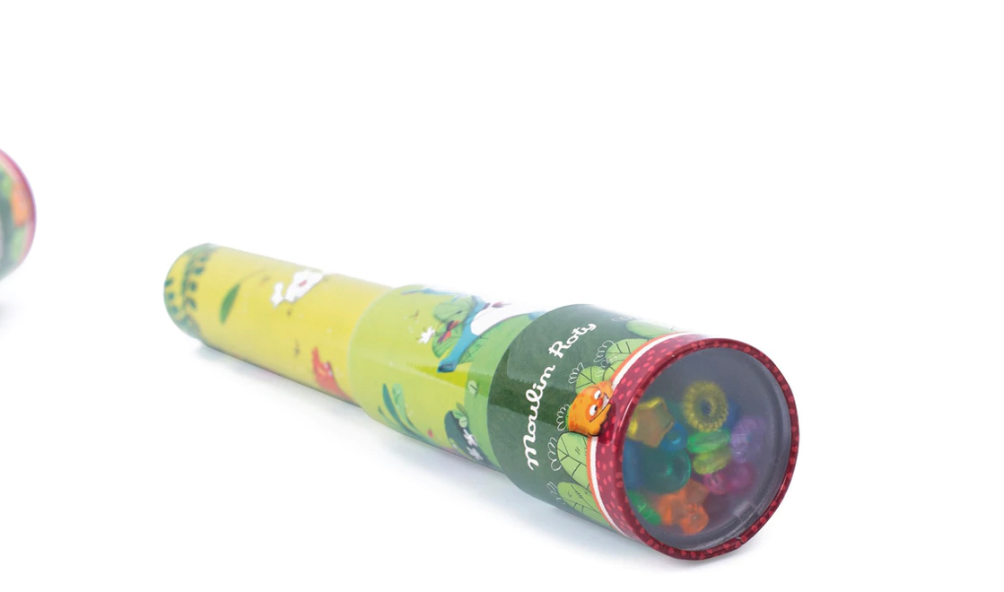 Caleidoscopio in latta illustrato con una giraffa musicista! Tutte le forme colorate all'interno associate ai piccoli specchi del caleidoscopio creerà infinite combinazioni di forme e colori. Ruota le due parti del caleidoscopio contemporaneamente in direzioni opposte per scoprire sempre più nuove combinazioni di colori.