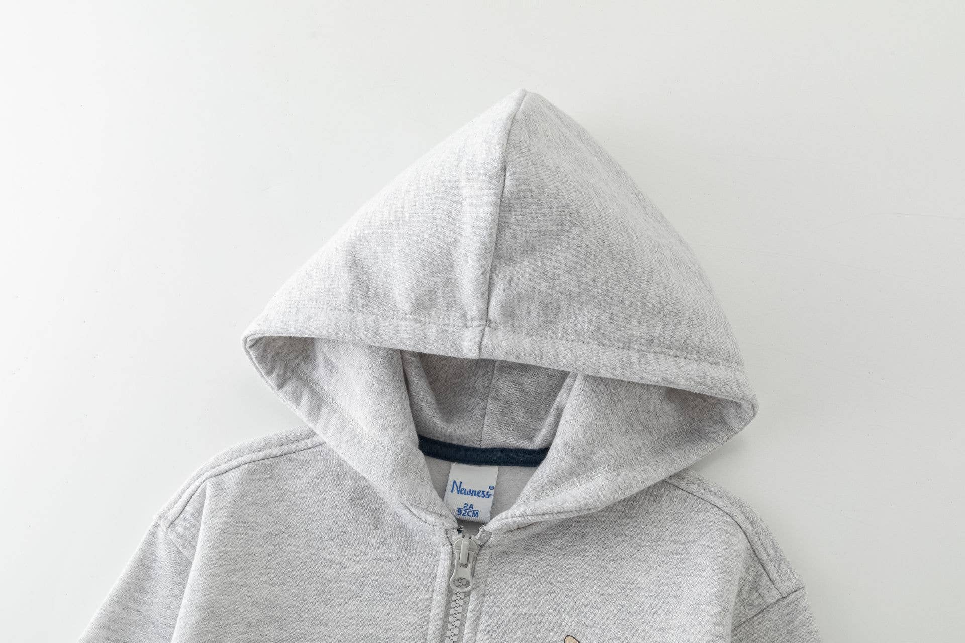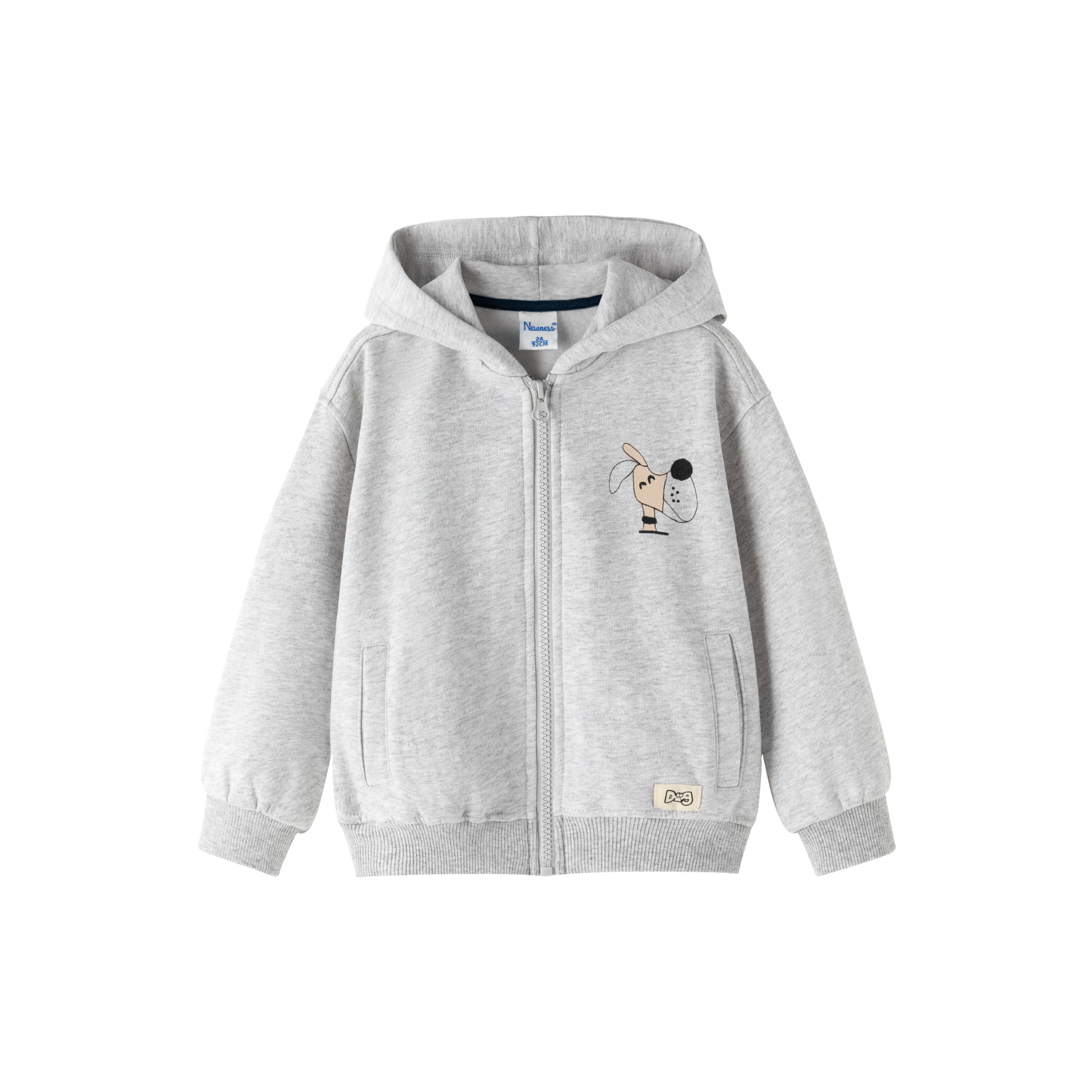 Felpa con cappuccio per bambino e collo a scatola, con chiusura a cerniera. Grafica anteriore animale con frase sulla schiena e maniche, con tasca nella parte anteriore del capo. Capo in grigio. Abbigliamento per bambino. 80% Cotone, 20% Poliestere SKU: JBI65291