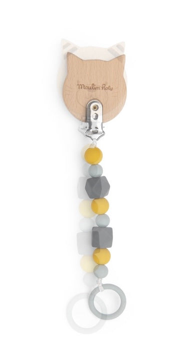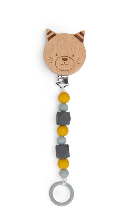 Cerchi un porta ciuccio? Questo è realizzato con perline di diversa grandezza in morbido silicone alimentare, mentre la clip è fatta in legno di faggio