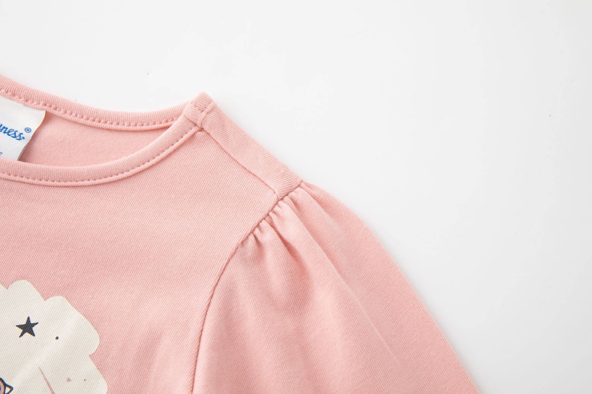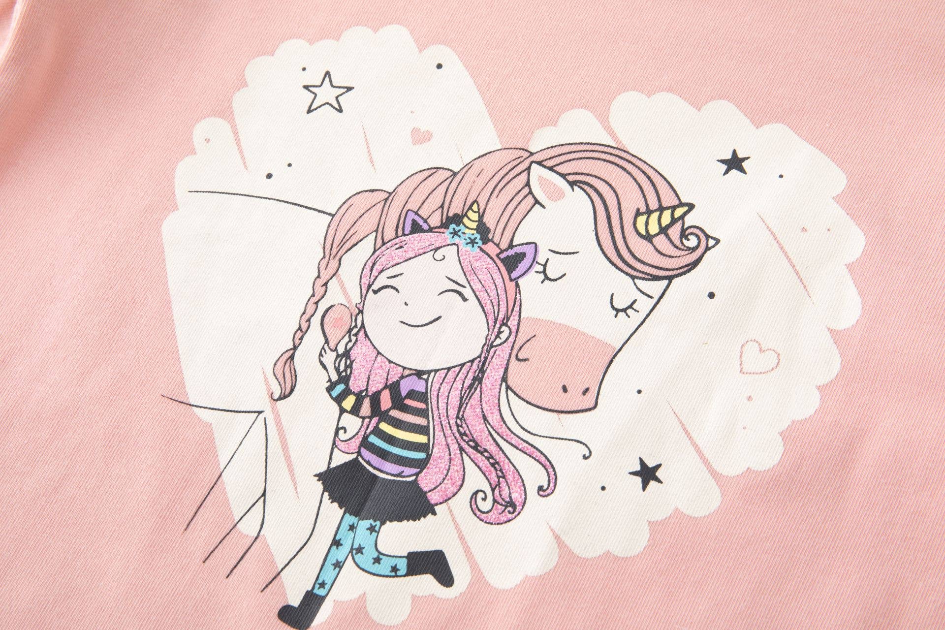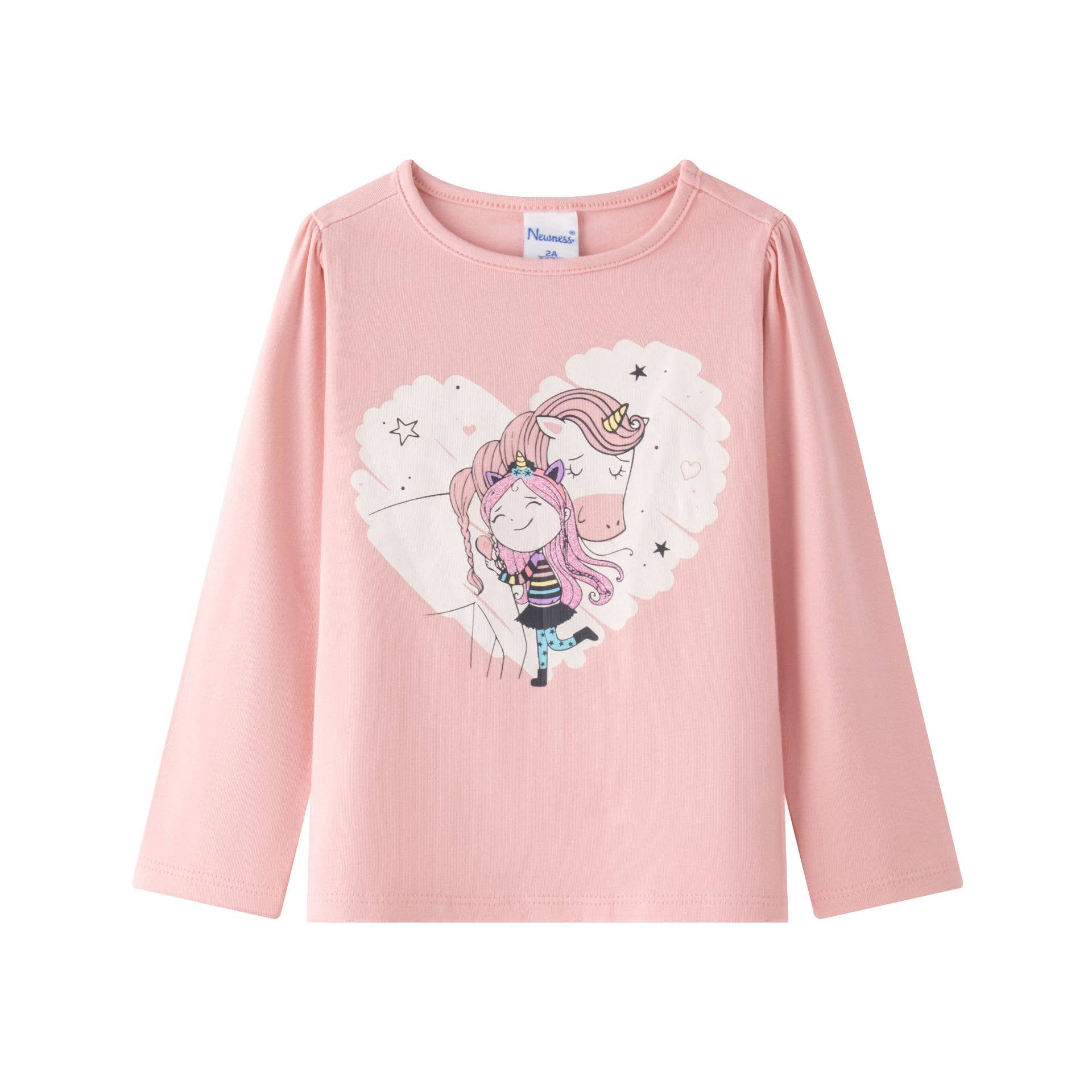 Maglietta a maniche lunghe con arricciatura sulla spalla per bambina. Grafica di bambola e unicorno stampata ad acqua e dettagli in glitter. Elastico interno con volant al polso. Abbigliamento per bambina. SKU: JGI64816