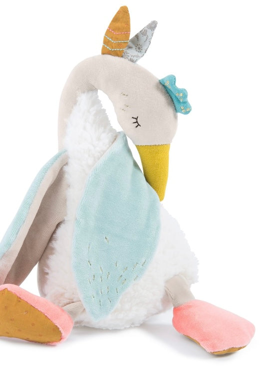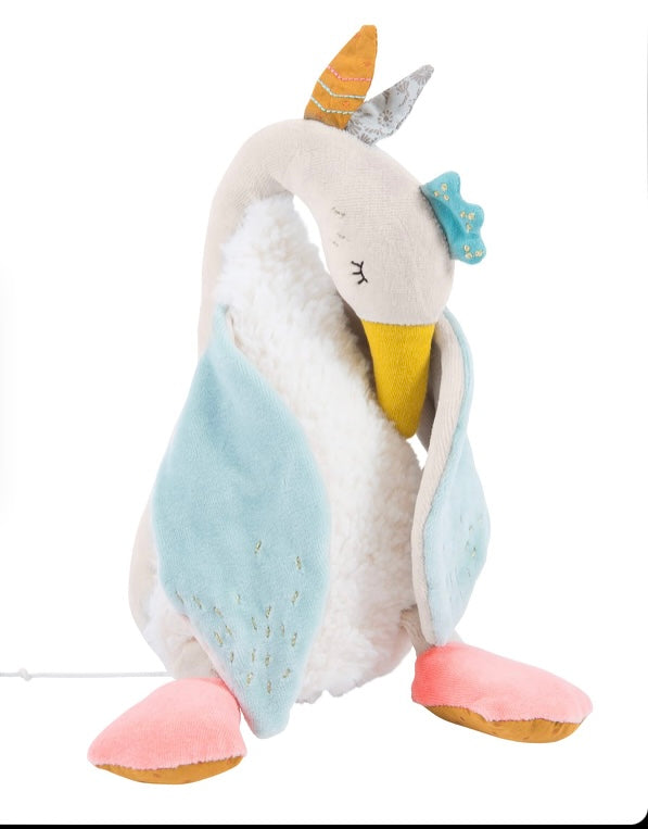 Un’adorabile peluche musicale con il design ricercato di Moulin Roty, che emette una dolce melodia per accompagnare il tuo bambino durante il momento della nanna.